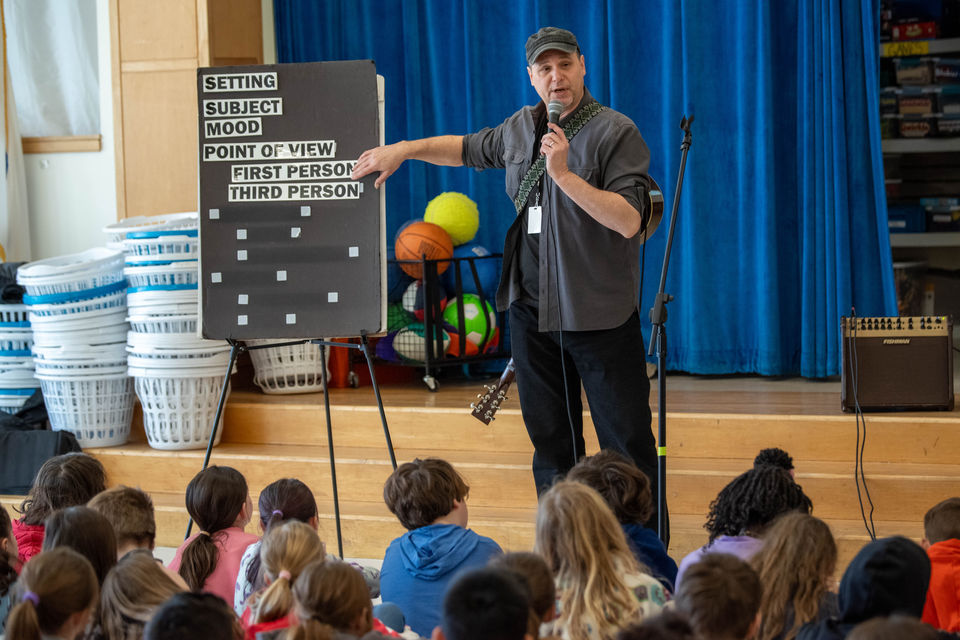 Alastair Moock brings his guitar and his passion for American folk music to teach students fundamental language arts skills in this spirited, interactive program. Using well known folk songs, contemporary tunes, and gems from his own catalog, Alastair helps students identify key concepts such as subject, mood, setting, and point of view, and to recognize how writers use rhythm and sonic patterns like rhyme and alliteration to engage readers (or, in this case, listeners). After singing and discussion, kids put what they’ve learned to work, helping to craft a new verse for one of Alastair’s original songs. The presentation gives students a fresh perspective on the power and fun of language and leaves them feeling inspired and empowered to express themselves through writing.